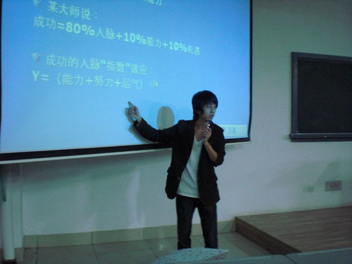 “我们的组织”。赵钦主席说,一个组织需要领导,领导把持大局,果断地决策,并且保持对事情的敏感性,协调各部门的工作,承担自己的责任,注重培养人才;团结是组织的根本原则;分工合作才能将活动顺利举行;相互的沟通了解上下层的情况有助于正确对待组织活动;团队文化体现一个组织的精神,五部分缺一不可。他反复阐述,学生组织的经历是个厚积薄发的过程,这些经历将会是以后宝贵的财富。