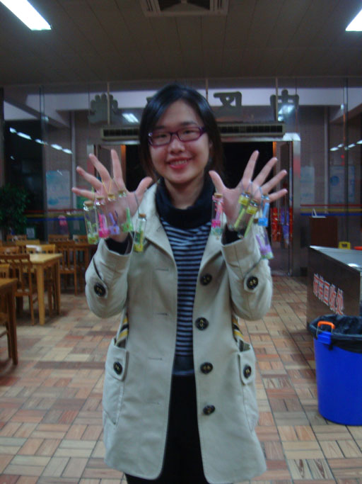 最后是平安夜活动的压轴环节。作为对我们08级(1)班近来出色表现的回馈,班长翟梦晨和生活委员郑燕云特意筹备了一份大大的礼物。接着班长和团支书共同开启了这份珍贵的礼物——满满一箱的红苹果。礼物虽然朴实,但确象征着来年平平安安。最后,生活委员为每一位同学分发了印有各自星座的许愿瓶,同学们握着精致的许愿瓶,为自己的未来许下了心中的愿望。当然,08级(1)班的每一位同学都有一个共同的愿望,那就是希望我们可爱的班集体能够越来越好。