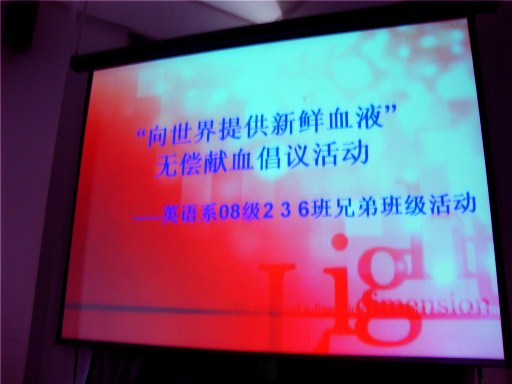映照着丝丝光束,浮动着朵朵白云,吹拂着瑟瑟秋风,掩映着腔腔热情,凝聚着颗颗爱心。10月27日早晨10点整,08级英语系2班、3班、6班团支部成员相聚教学楼1号楼108教室,举行献血常识宣讲及宣传活动。全场热情澎湃,好奇不止、积极不已。