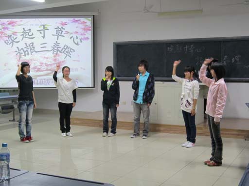 2010.10.27.10级英语系(5)班在公一#316教室召开了以感恩为主题的“唤起寸草心,报得三春晖”主题班会。出席班会的嘉宾有辅导员陈毅超老师、英语系学生会主席杨亚麟学姐及学生会部分部门部长。通过此次班会同学们更加深刻地了解了“什么是感恩”“感恩的对象有哪些”“怎样学会感恩”等话题。在班会的最后,每位同学都在小卡片上写下了藏在心里的一直想对父母说的却不曾说过的话。向父母们表达了我们心底最最真挚的情感。