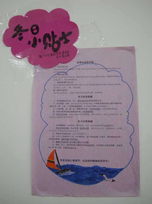 教室墙上粘贴着手工绘制的冬日小贴士。活泼生动的外型,精心挑选的保健小常识以及富有寓意的背景图案,细腻地展现了英语系学生党支部对考研学子的关爱。幸运的四叶草带着我们的祝福,乘风破浪的帆船和海鸥鼓励每一个考研学子奋勇向前。