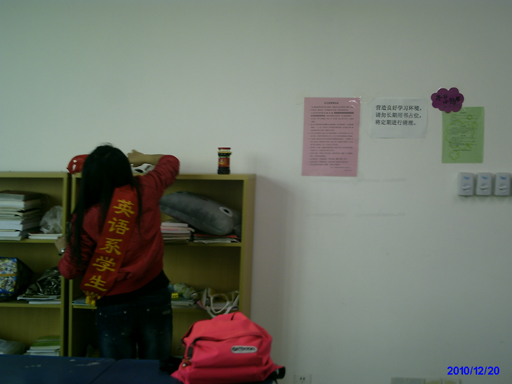一排排紧挨着的课桌,一摞摞累得高高的教材,空气里始终弥漫着一股书香味。两位成员认真并小心翼翼地擦拭着课桌、书橱以及窗户的每一个角落。所拭之处,留下的是成员们对考研学子的一分关怀,一分鼓励和一分敬意。蓦然回首,迎面的是考研学子们一脸灿烂的微笑,温情与感恩温暖了这一严冬。