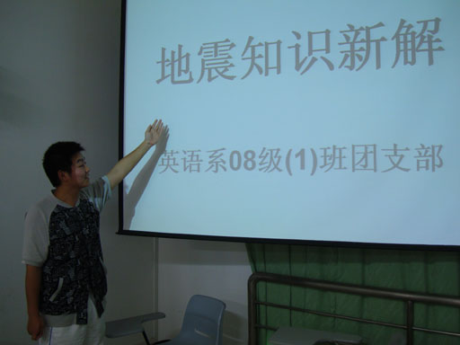 本次活动中,08级(1)班班长翟梦晨同学以PPT的形式向同学们讲解了地震逃生方法及注意事项。首先,翟梦晨同学细致地为大家分析地震发生的原因以及征兆,并讲述了预测地震的方法----观测地震云,以汶川地震和玉树地震为切入点,着重讲解在地震发生时如何逃生自救,以及震后的自我心理调节。