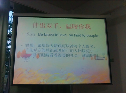 10月31日,英语系09(3)班团支部就“小悦悦事件”于公一119召开主题为“拒绝冷漠,传递温暖”班会,引导同学们拒绝冷漠,奉献爱心,传递温暖。