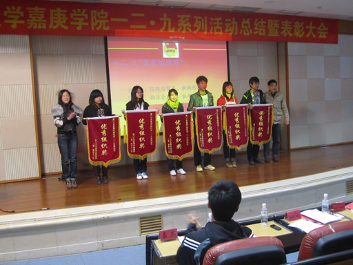 其次,大会先后颁发了环校跑比赛团体奖、党团知识竞赛团体奖、油纸伞面设计大赛奖项、一二.九“积极分子”和一二.九“优秀组织奖”等五个奖项,共由六个系和119人获得。我系荣获了党团竞赛三等奖。