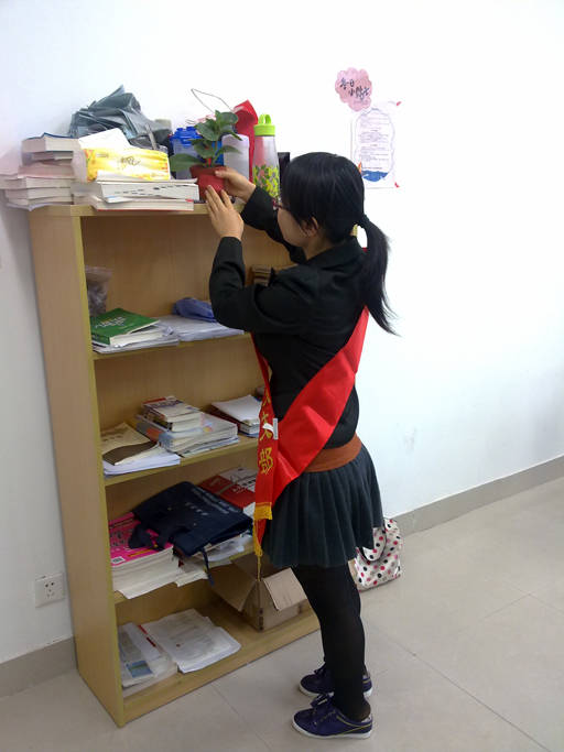 看着书桌上堆砌的书本和生活用品,不禁令人回味高三,那般的水深火热日子对于普通大学生已经是过往云烟无心碰及,而他们却坚持三点一线的生活,只为博取明日理想高校的录取通知单,这难道不需要一种蛹化成蝶的意志力来支撑么?深感敬佩的同时,我们也应当为他们做点什么。我们轻声细语的步入教室,对纸张垃圾等进行清理,并给盆栽浇水。看着经过打扫整理的教室,焕然一新,欣喜油然而生。