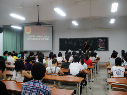 2011年9月7日晚七点半,英语系11级新生入党流程说明会暨团总支纳新宣讲会在公共教学楼一号楼404隆重举行。首先,主持人宣布活动开始及介绍到场嘉宾,一张团总支的还珠格格版的全家福,吸引了全场的目光,使现场奠定了欢快轻松的氛围。