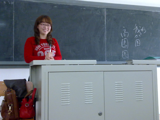 接下来的环节就是“师生”互动了。同学们好奇的是在日本工作情况,生活环境等等。园园姐说日本的工作因人而异,学历高的也是有找不到工作的,压力高的人也不少。关于日本旅游地方推荐方面,园园姐介绍了几个有名的休闲胜地,希望我们有机会可以亲自去看看。还有歌舞伎不可错过,那是日本传统文化的代表。就最近日本发生的地震海啸,同学们较为关心的是园园姐姐居住的地方是否受影响,她则分析了地理形势说明自己在日本是安全的。