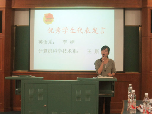 参加本次团课的英语系和计算机科学与技术系的同学们首先回顾了开学式和四次团课讲座的精彩内容,再次体会到了团课带来的,感动与体会。接着,优秀学生代表,英语系的李楠同学和计算机科学与技术系的王斯玉同学分别对此次团课发表总结讲话。
