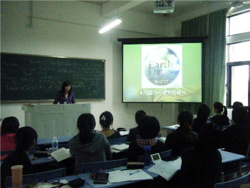 同学们首先了解了今年地球日的主题——“珍惜地球资源、转变发展方式”。接着,大家一起观看了一段公益广告《Give The Earth A Hand》。虽然只是一个短短2分钟的视频,却给同学们带来了深深的震撼,它让我们知道地球只有一个,地球需要我们的帮助。然后,一组关于环境恶化的照片给同学们带来了深刻的反思,反思自己在日常生活中的不环保行为,反思自己给地球带来的伤害。最后,团支书提出了关于“低碳环保,从身边做起”的几点倡议,希望大家能够从日常生活小事做起,爱护地球,如少用一次性筷子和餐盒等。
