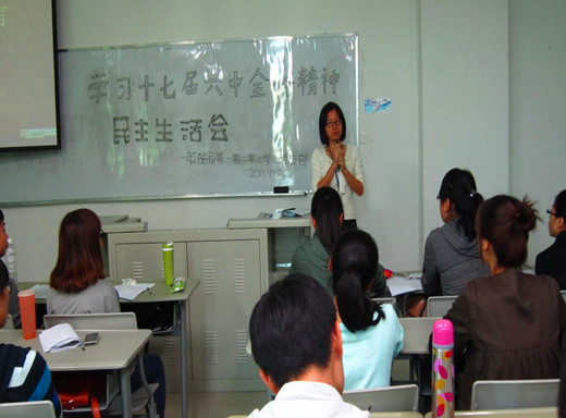 为认真学习贯彻党的十七届六中全会精神,英语系第一、第二、第三学生党支部于2011年11月22日中午12点30在经管#214举办了主题为“深入学习十七届六中全会精神 争做优秀党员”的民主生活会,学工部副部长李三伟老师何英语系行政秘书兼辅导员李婧老师参加了本次民主生活会。