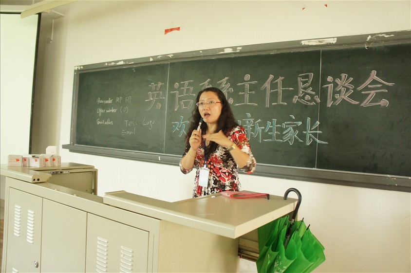 一开场,系主任杨昆老师便用她流利的英语让在座的新生与家长感受到英语语言文化的魅力。而后杨昆老师先与新生进行互动,鼓励同学们应该踊跃发言,把握能够学习的每一次机会。而英语系系徽的介绍则令人印象极为深刻。