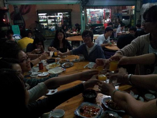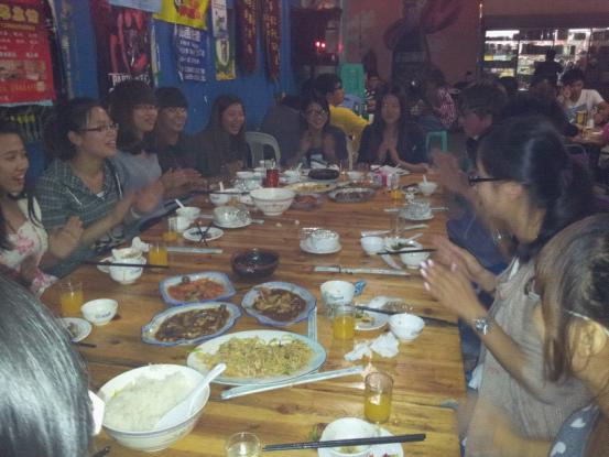 临近年末,我们举行了一次简单的聚餐活动。大家很久没有聚在一块坐下来聊聊天好好吃饭,于是这次活动就只有这个简单的目的。地点依然在校区外的大排档。大家坐下来,一块围着吃饭。虽然冬天有点冷,但是大家一块却很幸福很温暖。我们玩起了接龙游戏,考验了大家的应变能力。有几个同学一时想不起来如何接龙,就让他们即兴表演话剧。或者唱歌。大家欢声笑语不断。席间,班长和团支书进行了工作的汇报和总结。加紧了班委们和同学们的联系。促进了工作的发展。