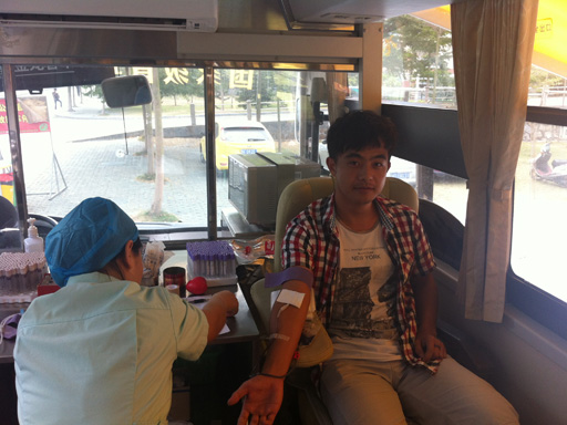 在献血活动中,医生为献血活动作现场指导。英语系学生党支部与英语系团总支的成员们维持现场秩序,并积极配合血站工作人员进行工作。献血于上午10点正式开始,填表、体检、化验、等候、抽血、休息、领献血证以及纪念品,所有流程井然有序地进行着。中午高峰期人潮涌动,天气闷热,献血队伍排的很长,然而献血者们都在等候区面带微笑地耐心等候着。在现场采访中,新生曾华成表示第一次献血的激动与欣喜之情,同时也表达了每年都想参与献血的意愿。新生刘馨说:“能够将自己额外的血液给需要帮助的人,是自己的荣幸,同时献血也能够促进血液循环。”当部分同学因为疫苗或服药或其他身体原因没能符合献血要求时,都一再询问并表示十分遗憾。甚至有一些晕血的同学都前来献血,虽然医生没有让他们献血,但他们的奉献与爱心着实令人感动。