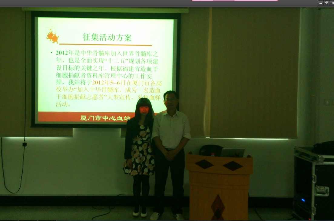 厦门市中心血站秘书长曾晓新医师主持并授课。首先,他简要介绍厦门市造血干细胞捐献的概况,阐述了2012年是中华骨髓库加入世界骨髓库之年,也是全面实现“十二五”规划各项建设目标的关键之年。同时,曾晓新医师倡议在场的志愿者骨干传播志愿文化,培育志愿精神,也希望藉此发挥高校学生社团的力量,共同推动中华骨髓库的建设。