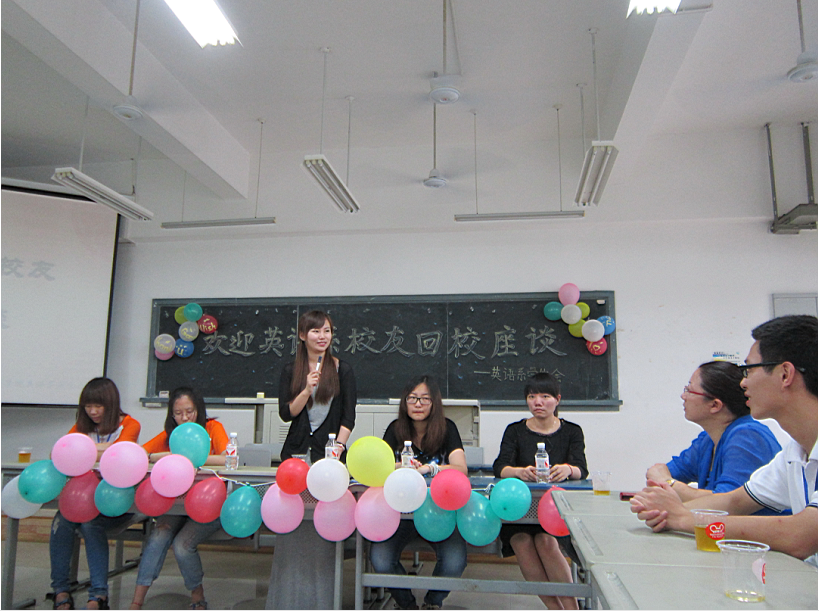 6月17日下午,在经管楼304英语系举行了“校友交流会”。此次会议有幸请来了英语系执行主任杨昆老师,陈毅超、李婧辅导员老师,07级毕业生吴京凡和08级毕业生黄筠筠、杨雅麟同学。