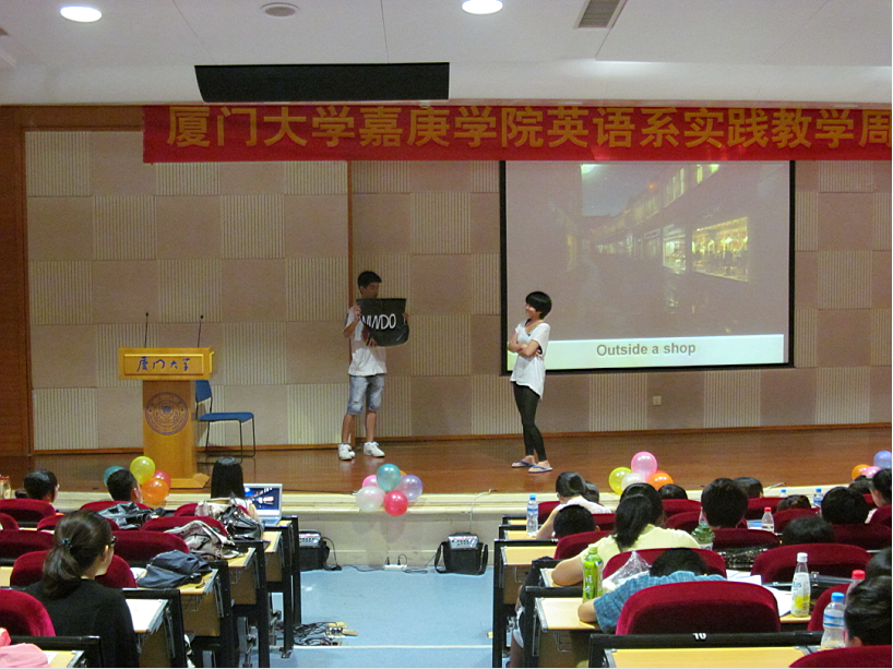 区别于低年级的同学,对于大三的学生,实践项目就更为注重语言能力的应用,对口笔译及商务方向的技能都有系统的实践,在展示过程中也能看到同学们在短短两周的时间里的提高。其中由王淑娥老师指导的商务场景模拟更是在学习的过程中收获爱心。学生们从实践周开始时仅有的250元本金,经过同学们的辛勤努力,到最后的1800多元的收益,这些都是同学们用心努力赚来的精彩。并且,收益的70%将代表英语系捐给西部需要帮助的孩子们,30%将作为下一届学生的启动资金。相信同学们都会把这两个月的酸甜苦辣一直保存在心中。由王迪老师指导的职业生涯与规划模块,便突破了传统对职业生涯规划的印象,将模块内容落实到了实践中。第一周同学们主要是对职场的定义,如何适应职场,简历的制作,面试技巧等基础性知识进行了学习,到随后过渡到第二周实践的应用。第二周主要是进行电视广告创意大赛以及实践汇报演出的相关工作。同学们别处心裁的为广告定名为“爸儿乐”奶粉,在展示过程中,同学们为我们详细的解说了此广告创意的构思,创作过程及组员的分工。值得一提的是,在创作过程中,同学们并没有照本宣科,而是有创意的有思想的将一些原理和日常生活中的艺术运用到广告中,例如伏笔原理,以及泉州特有的提线木偶传统手工艺。也许这样一个创意广告并不会对将来求职带来多大的帮助,但是创作广告的过程里,同学们收获的艰辛及感动,定会在未来的学习生活中得到升华。