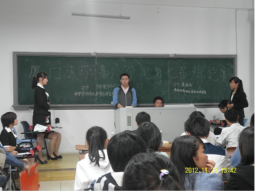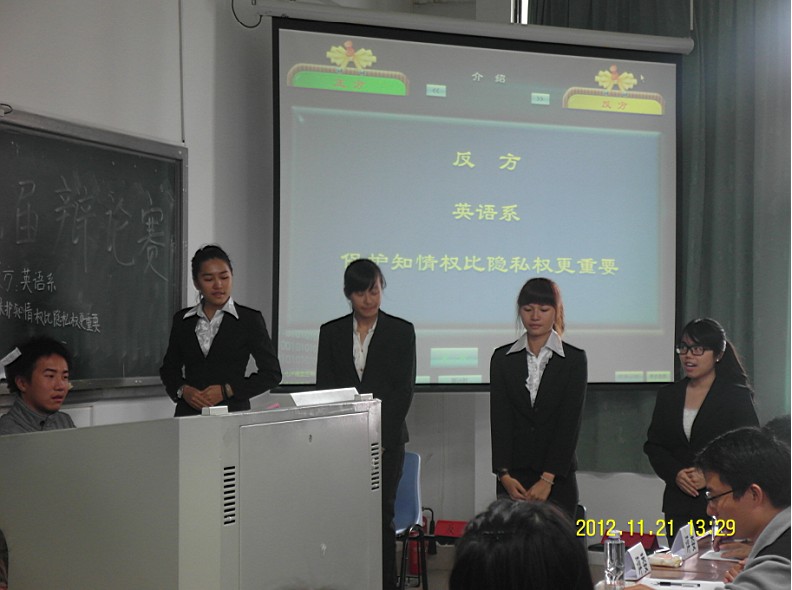 2012年11月21日中午13:20,在主楼群4号楼509有关保护隐私权和知情权哪个更重要的辩论赛紧张有序的展开。参加此次比赛的有来自环境科学系的正方选手(保护隐私权更重要):王文析、董榕华、陈佳琪、颜伟其;和来自英语系的反方辩手(保护知情权更重要):彭慧、王敏华、蒋子燕、汤琳颖。此次比赛获胜的是环境科学系的辩论队,获得最佳辩手的是英语的一号辩手:彭慧。