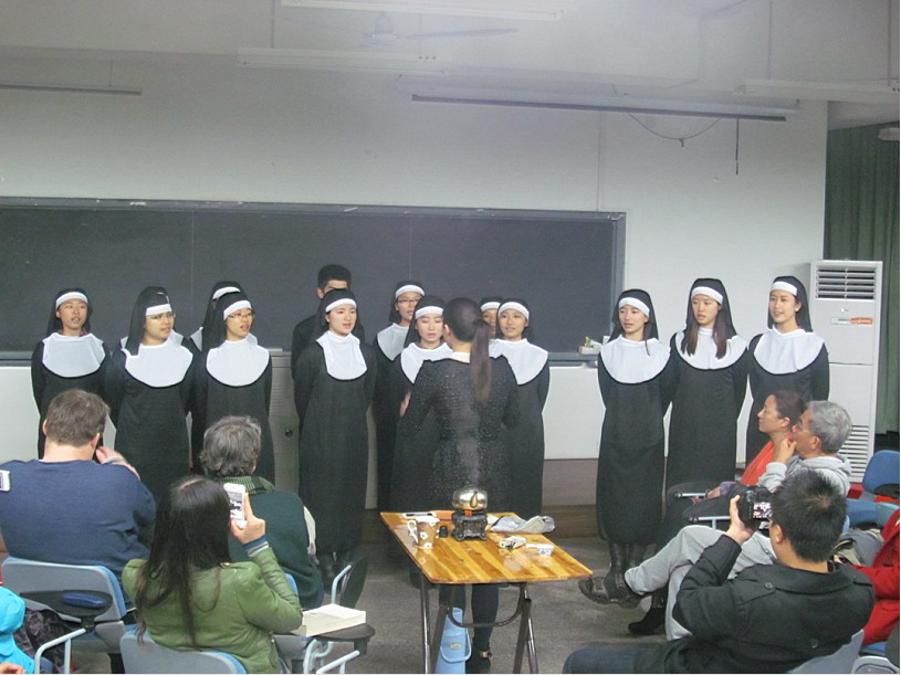 Steve以不久前刚落下帷幕的话剧比赛和合唱大赛引入主题,开始讨论圣诞节的过节气氛。Steve和另外两位外教以及杨主任都分享了自己的圣诞经历,同时Change还指出了中国与美国过圣诞节的差异。在美国,人们过圣诞节的气氛更为浓厚,更重视圣诞节,人们都会互相送递祝福卡片。中场休息时间,Steve邀请了2010级3班的同学在脱口秀现场表演了他们在英文歌曲合唱大赛的曲目《I will follow him》。他们精彩的演出获得了现场观众的热烈掌声,大大地活跃了现场的气氛。