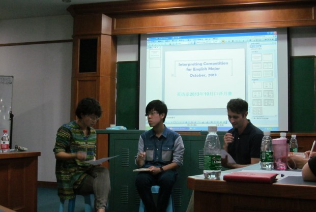 本次口译大赛面向英语系2010和2011级所有在校学生。比赛分为汉译英和英译汉两种形式。英译汉邀请外教Kyle用标准的英式口音讲述一段英文材料,要求同学能用中文现场表述。比赛的内容涉及政治和医疗。参加比赛的选手不但要掌握良好的外语,还要有较宽的知识面和临场应变能力。