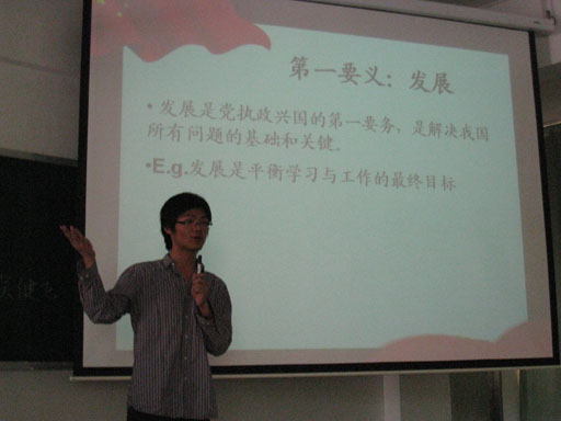 之后,他从科学发展观的内容入手,深入浅出的为大家讲解如何将科学发展观理论与实际生活相结合,并将自己总结出一套有效平衡工作与学习的方法——“TO PEE”理论与同学们分享。