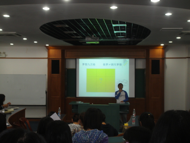 接着刘老师又采用了时下各大网络最流行的九宫格的形式让同学们勾勒出自己的梦想。同时指出人生就是一种无法抗拒的前进,每个人都应怀有一颗上进求学的心,一颗永不退缩的赤子之心。当刘老师提到一位同学被大使馆拒签第十六次时,终于打动了大使馆的官员。因为他的导师说:“人最成熟的时候就是在遇到困难时所产生的风度翩翩。”于是这个同学每次都彬彬有礼的去接受下一次的拒签,这就是刘丰老师想说的,成功是建立在无数次的失败之上的,我们要学会去失败,接受失败,不断失败,才能迈向成功的大门。