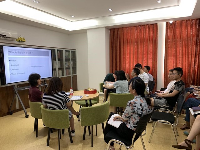沙龙一开始,周院长用英文提出了“What is there in a text?”,通常我们在思考回答这个问题时会局限在words, sentences, grammar, thesis statement等,所有这些语言点都是within a context,紧接着周院长又提出“What is there in the context?”这一问题,引出“Anything that helps create or make the meaning of the text”其实都是context的观点。基于此,周院长认为,要避免把单词和语法讲解变成字典和语法书,必须把单词、句型和语法放在context中来讲,这也是语言的本质所决定了的。