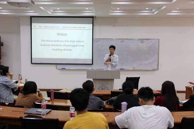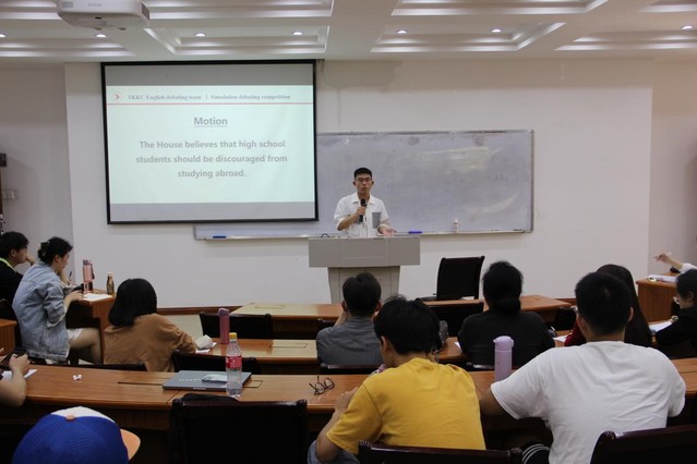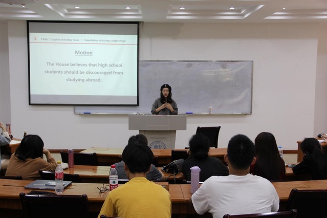 三月初,一场由厦门大学嘉庚学院英语语言文学院英语辩论赛团队举办的英语辩论赛在经管楼207教室拉开帷幕,此次辩题为“The House believes that high school students should be discouraged from studying abroad.”本次英语辩论赛制采取的是英国议会制,按照赛制,共有八名选手参赛,两人成队,共四组,分别代表政府方和反对方对辩题展开辩论,选手身份均抽签决定。与此同时,本次活动邀请了6名来自英语语言文化学院的老师,由陆红艳老师负责,其他6位老师包括孙力、左慧芳、辜莹莹、丰斌、李先林、陈柏(场记)老师任评委。