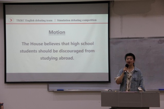 比赛在正方首相(简称一辩)曹芯睿选手的陈词中吹响了号角,她清晰地用英文将目标群体分类,并定义了出国留学的范围和概念,重点透析了该群体出国留学的行为的趋势与存在的弊端,而这一释义马上遭到了反对党领袖(即反方一辩)徐婷娟的当庭反驳。在她铿锵有力的论述中,她定位了高中生的生理和心理发展水平与成人的无限接近性,并把结合人的发展观与文化的多样性相结合,反复强调高中生出国留学和思想格局的必要性。两方一辩的开门见山也为各自阵营中其他辩手的“增援”提供了良好的开端与暖场,这场针尖对麦芒随即进入拉锯战。