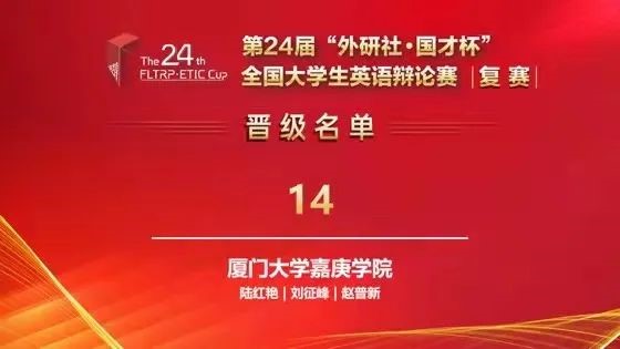2022年4月15日下午5点至次日下午3点,第24届“外研社-国才杯-全国大学生英语辩论赛(复赛)”在线上如期举行,历时两天,以BP赛制(英国议会制)为规则,共近120支来自全国各大高校的队伍参赛,代表厦门大学嘉庚学院出战的两名选手赵普新(19级中文)和刘征峰(20级英语)在历经了共5轮的精彩角逐后,以出色的发挥后来居上,总积分进入赛会前15名,斩获大赛一等奖,并直接入围六月份的全国决赛。