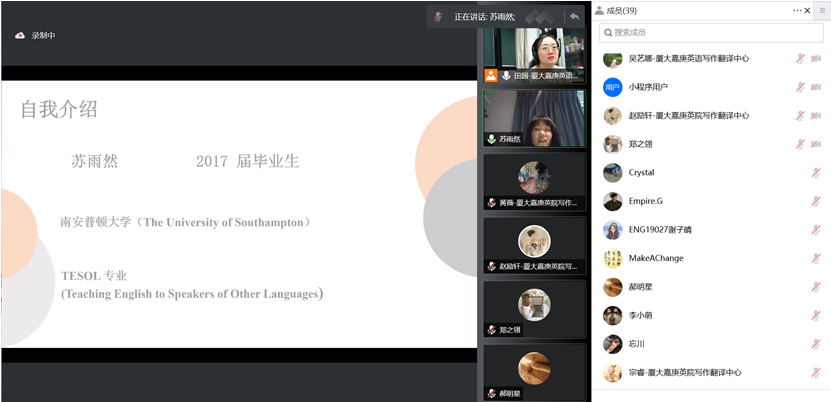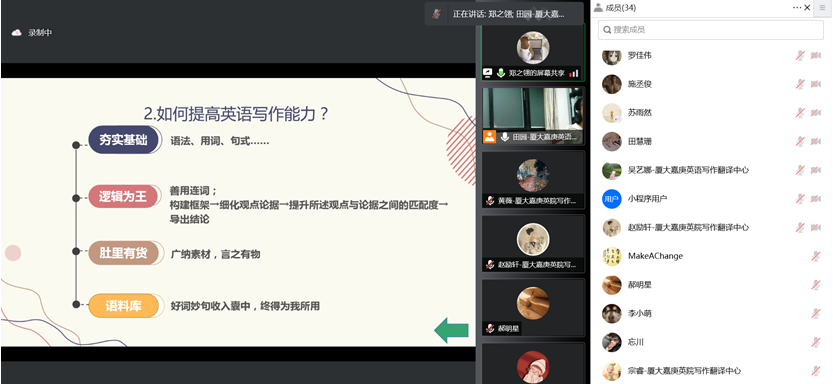 5月10日19:30-21:40,金年会jinnianhuicom写作翻译中心通过云端(腾讯会议)组织了一次优秀毕业生英语学习论坛。论坛主题为English Written Communication:Importance and Practice, 由写作翻译中心负责人田园老师主持,两位2017级毕业生郑之翎和苏雨然作为特邀嘉宾,进行了英语写作经验的交流和分享。本次论坛参与人员主要为金年会jinnianhuicom的老师和同学,写作翻译中心的老师赵励轩、吴艺娜、宗睿和黄薇,以及学院教师郝明星、余胜和宋晓东等,也参与了此次论坛。高峰期有共计近60人参与论坛。