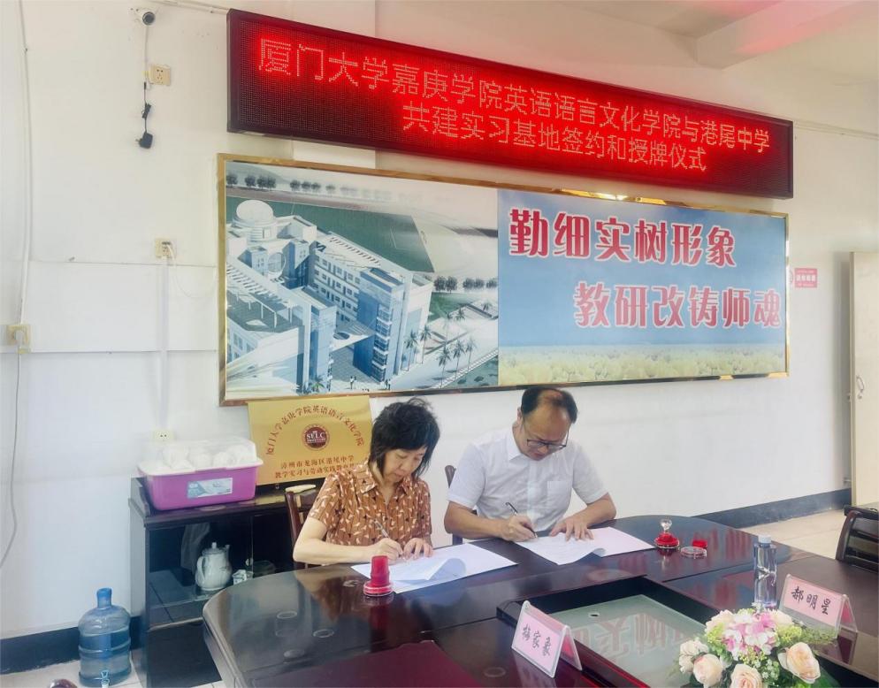 座谈会后,金年会院长周郁蓓与港尾中学校长甘伟德签署了金年会jinnianhuicom与漳州市龙海区港尾中学本科教学实习及劳动实践基地协议,周郁蓓院长随后为港尾中学实习基地挂牌。