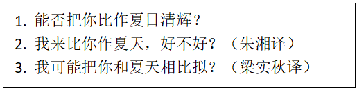 以上三个翻译版本其实都存在问题,那就是中国的文化之中,不会把美女比作夏天。如果我们评论一位美女时说“你就像夏天一样美”,会给人一种很奇怪的感觉。对于这个问题,林隆祺老师解释说,这应该和英国的气候有关,英国一年四季除了夏季,都是阴沉沉的,夏天是最舒服的季节,充满阳光,温暖舒适,很容易让人联想到美女。但是我们中国的气候条件和英国不同,夏天也不会引起我们像英国人那样的联想。曾老师补充道,这便是语境里不可跨越边境的例子。
