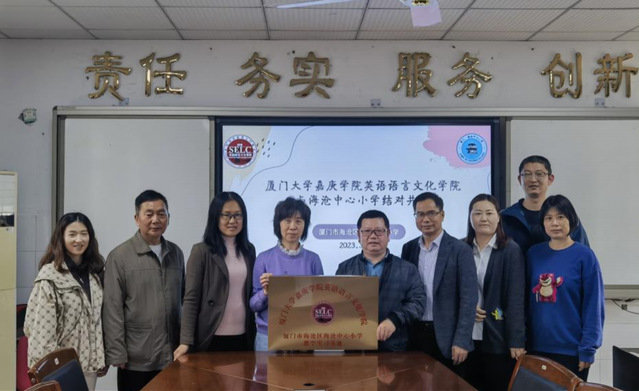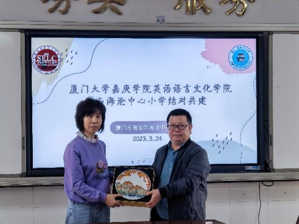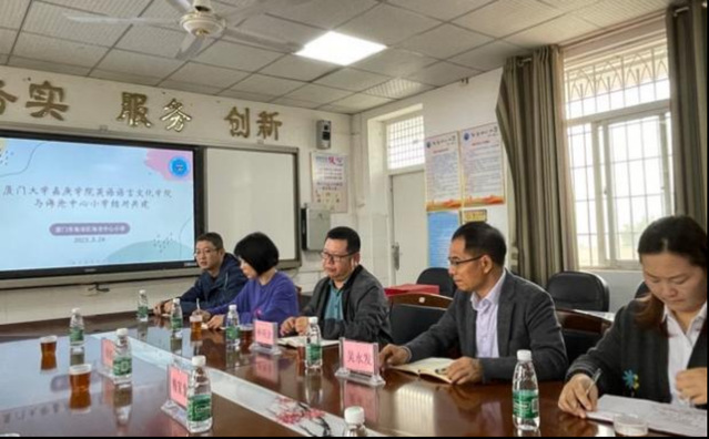 2023年3月24日,英语语言学院院长周郁蓓,教工支部书记梅家象,院长助理蔡秀星,办公室主任李娜,学院教师邓帆及英语专业学生邹隽宇一行前往厦门市海沧中心小学参加实践基地签约和授牌仪式。海沧中心小学校长林明全,副校长吴永发,教导室主任林秋专,办公室主任张剑云,德育副主任向红,出席了双方的座谈会以及签约和授牌仪式。