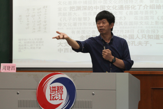 随后,周建昌老师便开始讲述林语堂的爱国情怀。从“家的回归”、“高地的人生观”、“故乡情结”等十二个方面具体阐述林语堂的爱国思想及爱国实践。周老师也通过列举一系列林语堂的文章来透析其中蕴含的爱国情思。在林语堂看来,“爱国不过是爱我们幼时所吃过的好东西”。