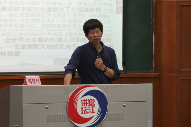 讲座伊始,周建昌老师对本次讲座的主题做了简单介绍。讲座的第一部分,周老师讲述起了林语堂其人。他对林语堂的生平背景做了介绍,其中包括了林语堂的祖父祖母和父母、林语堂与廖翠凤的美妙姻缘等,并用一张年谱清晰明了地向我们展示了林语堂的一生轨迹,赞誉其对中国文化传播的贡献及其在世界的崇高地位。
