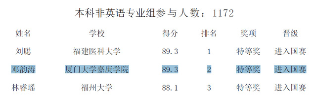 此前,在5月13日的福建省决赛中,邓韵涛同学荣获特等奖,以全省排名第二的好成绩成功晋级,代表我校参加全国决赛。