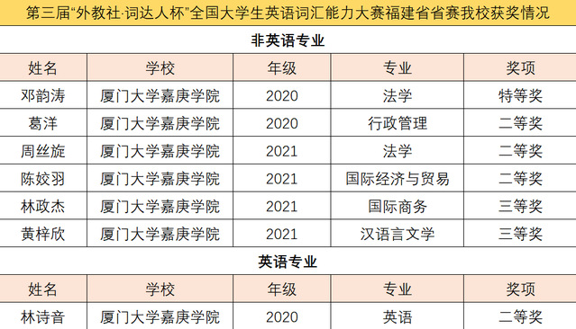 2023年5月27日,第三届“外教社·词达人杯”全国大学生英语词汇能力大赛全国决赛(线上)落下帷幕,我校选手邓韵涛斩获全国二等奖,这是我校首次在此赛事的全国决赛中获奖!(详情可查阅:https://mp.weixin.qq.com/s/ify0I5s2z4ZK3iIfrb6gXA)