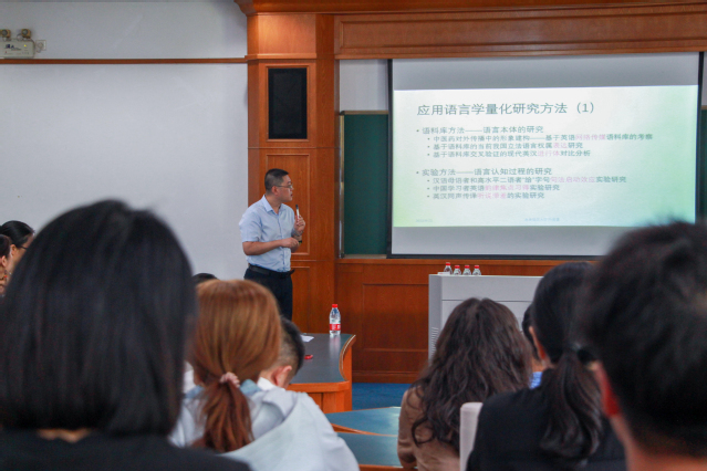 讲座伊始,许教授介绍了应用语言学研究方法的分类,即质性方法(解释主义研究)和量化方法(实证主义研究),量化方法包括语料库方法、实验方法和问卷调查方法,究竟采用哪一种方法,取决于具体的研究问题和研究对象。