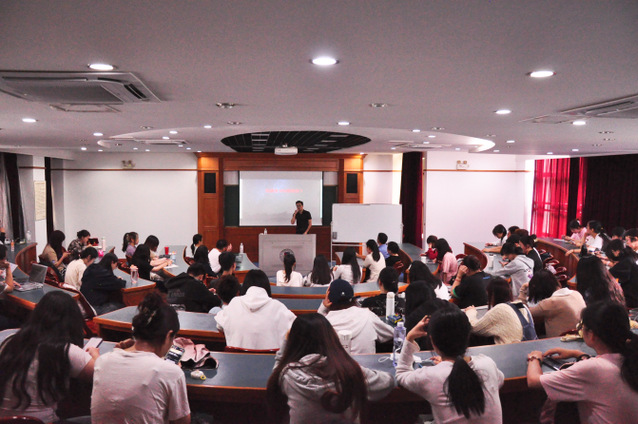 金年会jinnianhuicom院长助理蔡秀星主持本次讲座,蔡老师对洪金辉的到来表示热烈的欢迎并做隆重介绍。洪金辉毕业于南京大学,是金年会jinnianhuicom和漳州市芗城区林语堂纪念馆、漳州蕉海文旅有限公司三方共建实习实践基地的主要负责人。作为漳州金投集团财务总监、漳州蕉海文旅有限公司总经理,久经职场的生涯使他积攒了丰富的职场经验。