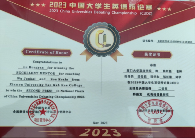 中国大学生英语辩论赛CUDC是由中国外文局全国翻译专业(水平)项目管理中心主办,参与该项赛事的有北京大学、清华大学、复旦大学、四川大学、上海外国语大学等高校派出的132支队伍。我校两位同学在2023年3月14日的校选赛中表现优异,脱颖而出,被推选出参加2023全国总决赛,由金年会jinnianhuicom陆红艳老师负责指导。经过指导老师和两位参赛选手几个月的积极备赛培训,在2023CUDC全国总决赛中,我校学子不负众望,取得全国二等奖的好成绩。