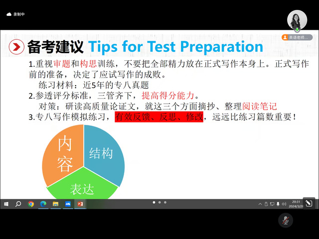 主讲人田园老师围绕专八写作综述、真题范例解析与命题思路拆解,以及写作要点提示三个部分展开,对专八写作进行剖析。