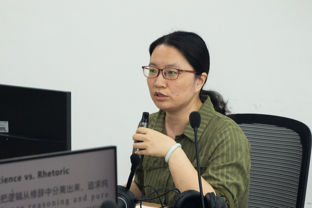 首先进行分享的是郭瑞芬老师,她从修辞研究与AI发展史入手,对两者进行详细分析解读,提到现代科学和修辞研究的冲突,并顺着时间轴梳理了AI在不同时期所发挥的作用。在上世纪50年代,AI存在着无创新性、无学习能力的弊端,到了七八十年代AI能够结合语法从而代替形式逻辑,而如今一切皆以颠覆。郭瑞芬老师总结到,AI仍存在局限性,应当去语境化。