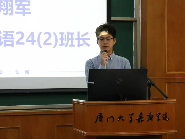 紧接着,新生代表董翔军同学给同学们带来了全英文的发言。他以饱满的热情和坚定的语气,分享了自己选择英语专业的初衷与对未来的展望。他提到,作为新生,在大学里既可以交到新朋友,也可以体验新鲜事物。他鼓励同学们要珍惜每一寸光阴,努力学习。确定自己的奋斗目标,不要畏惧困难,积极参与实践活动。董翔军的发言赢得了在场师生的热烈掌声,展现了新生一代的蓬勃朝气与不凡志向。